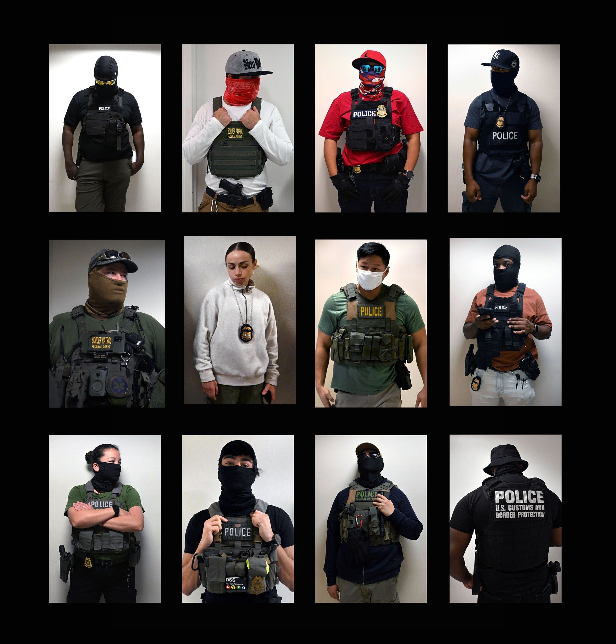 ICE agents, notably, do not have a standardized uniform, as most government agencies do. Instead, they’ve developed an ad hoc one: tactical vests, t-shirts, baseball caps, gaiters pulled up over their faces—on occasion, even wearing clothing meant to resemble the uniforms of other officials, like sheriffs’ deputies or corrections officers. (Charles W McFarlane paints an incredible portrait of the current-day ICE officer’s wardrobe in this recent GQ article.) In not wearing an official uniform, in deliberately obscuring their identities, in covering their faces with gaiters6 , ICE agents are asserting something else entirely: the ability to operate outside the law, free from supervision or oversight.