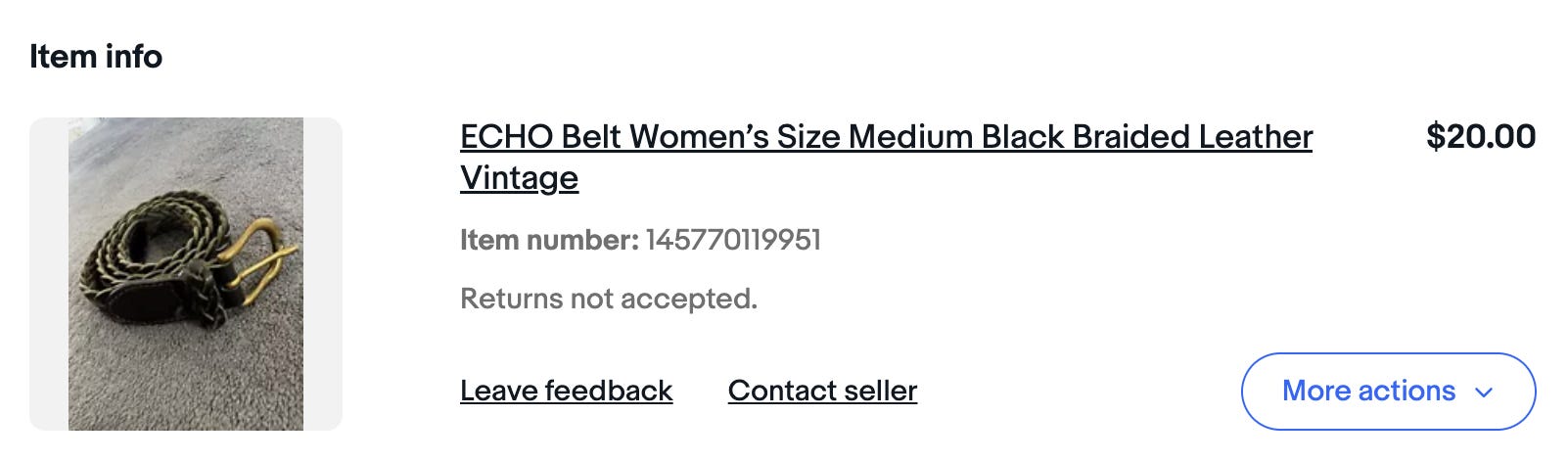 Black leather belt from eBay ($20): I think the quest for the black leather belt ends here—getting a braided belt instead of one that has discrete buckle holes is a good way to get around the surprisingly difficult task of properly sizing a belt based on online measurements.